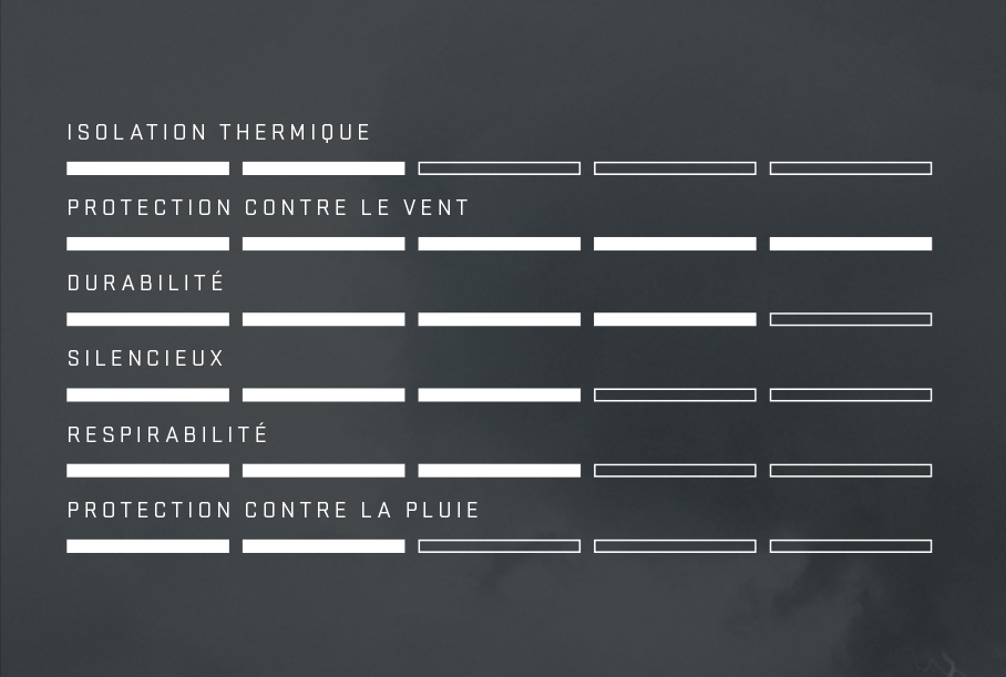 Matériaux et traitements spécifiquement choisis pour conférer des propriétés déperlantes légères.